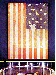 The actual flag that Francis Scott Key saw flying over Fort McHenry, Maryland the morning of September 14, 1814 is preserved at the Smithsonian Institution. Now a remnant, it measures 30 by 34 feet. (Note guard standing at lower left.)