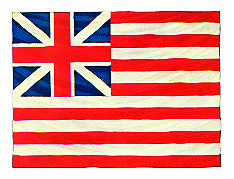 The first flag of the colonists to have any resemblance to the present Stars and Stripes. It was first flown by ships of the Colonial Fleet on the Delaware River. On December 3, 1775 it was raised aboard Capt. Esek Hopkin's flagship Alfred by John Paul Jones, then a navy lieutenant. Later the flag was raised on the liberty pole at Prospect Hill, which was near George Washington's headquarters in Cambridge, MA. It was the unofficial national flag on July 4, 1776, Independence Day; and it remained the unofficial national flag and ensign of the Navy until June 14, 1777 when the Continental Congress authorized the Stars and Stripes.